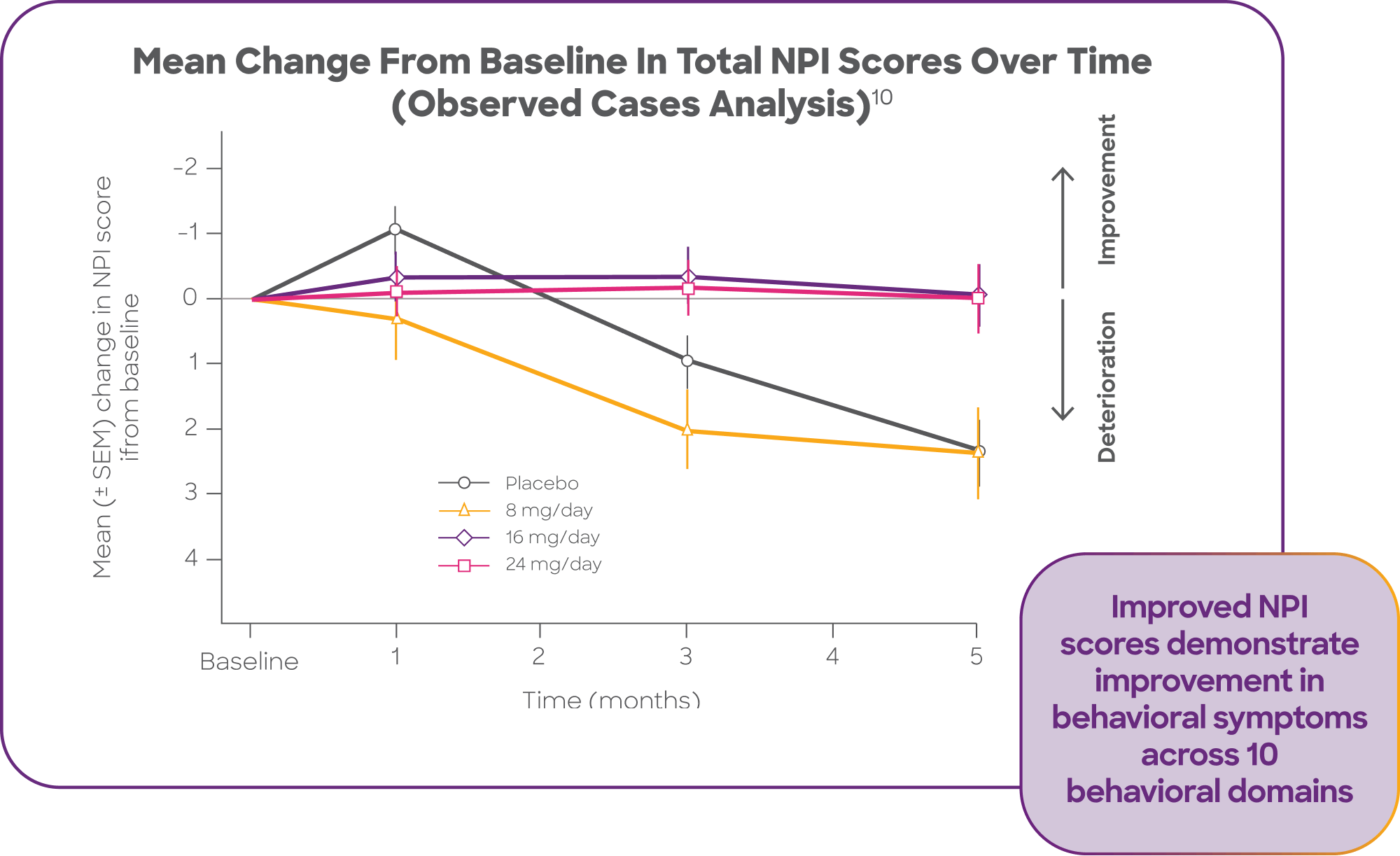 Among patients treated with galantamine (the active ingredient in ZUNVEYL), the results of the Neuropsychiatric Inventory (NPI) indicate a significant benefit of galantamine on behavioral symptoms compared to placebo.10